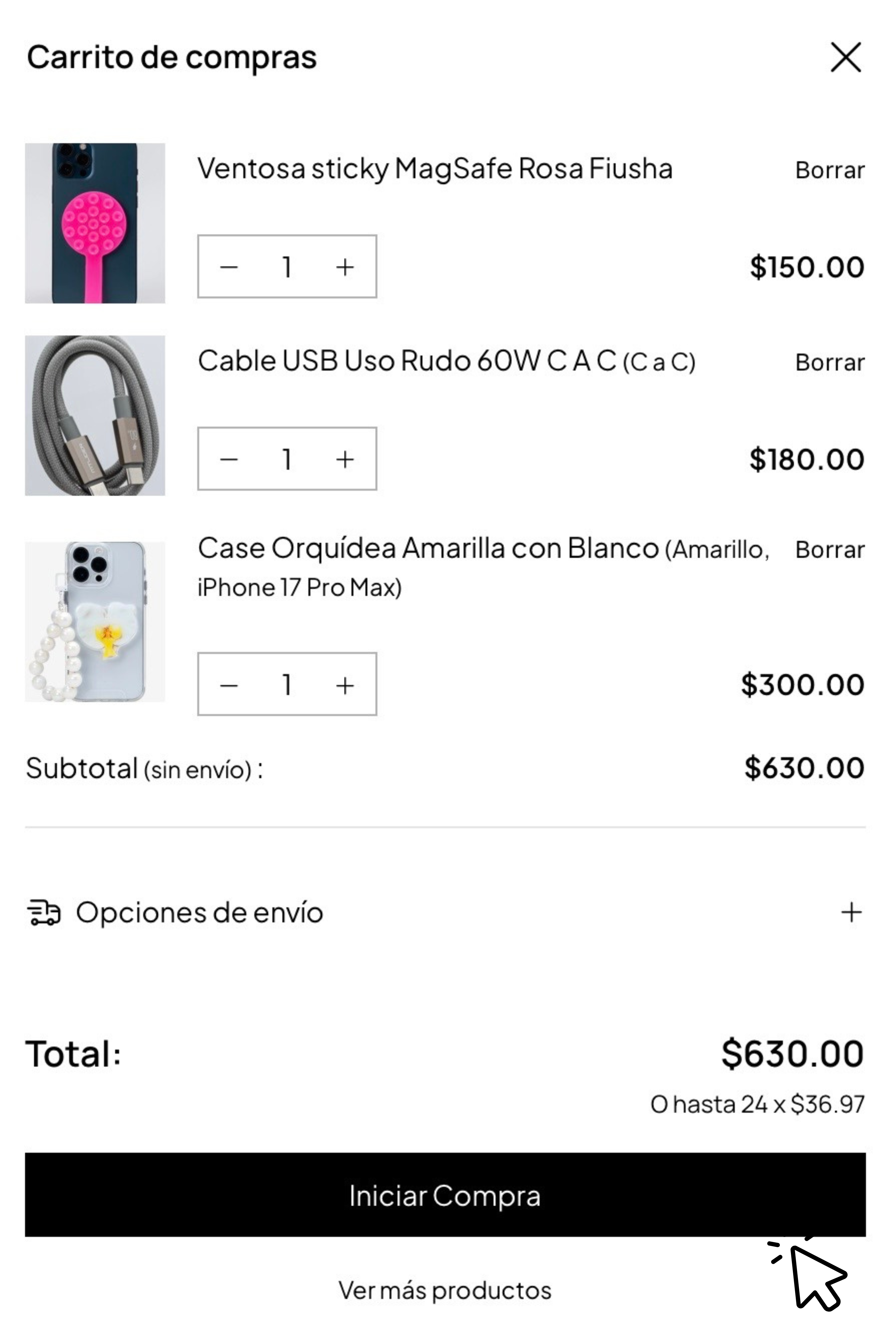 Al entrar a nuestra página selecciona la pestaña "productos" en el menú principal. Desde ahí podrás ver todas las categorías disponibles: cases, cargadores, audífonos, cables y más.